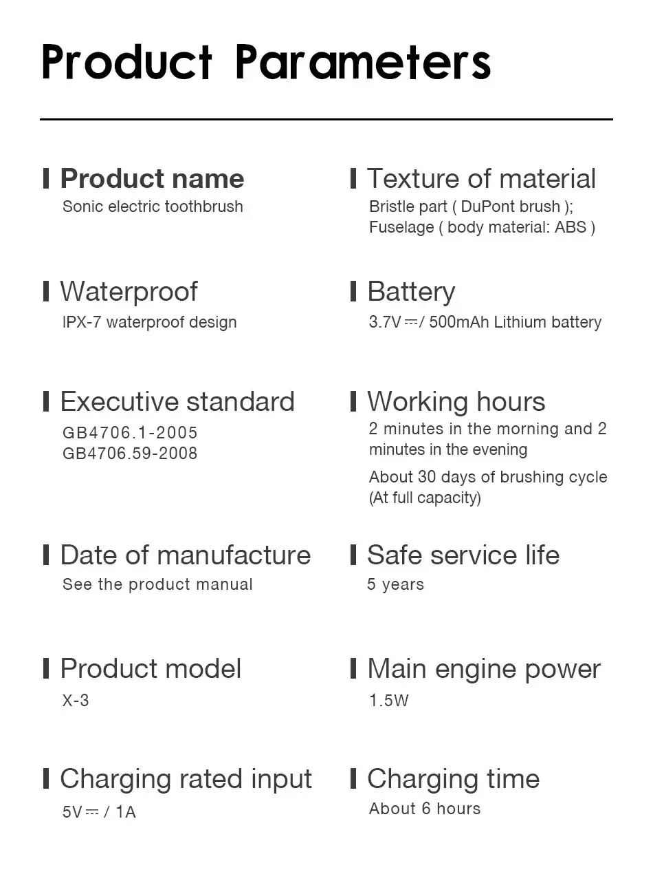 Working hours:2 minutes in the morning and 2 minutes in the evening.About 30 days of brushing cycle (At full capacity);